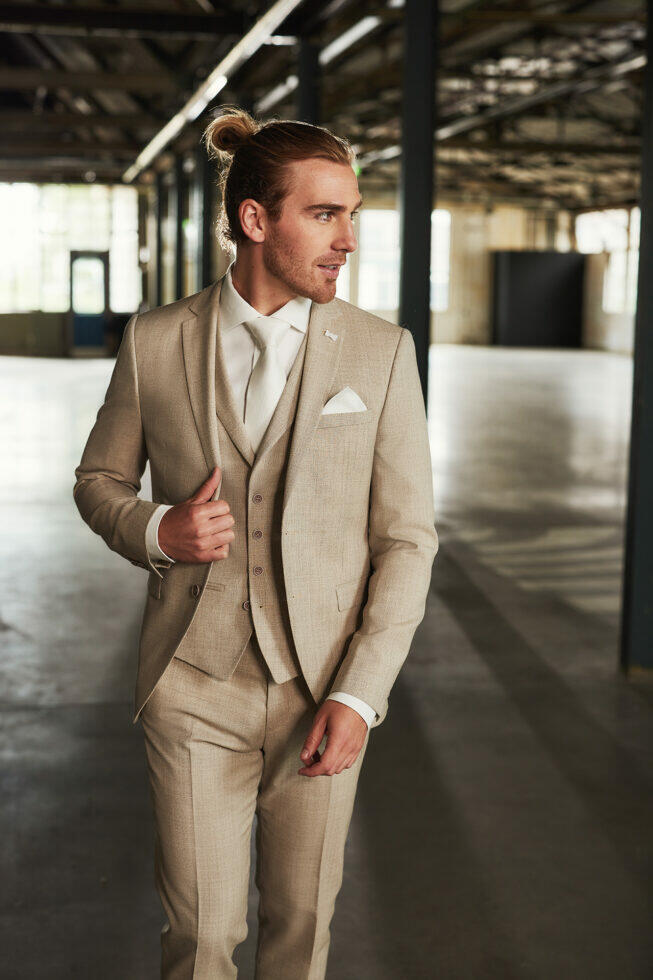 Model 24117-21 is een kostuum uit de Immediate Fashion collectie. Dit trendy trouwkostuum is in de kleur sand, met slankgeneden uni vest gecombineerd met een stijlvolle ivoor kleurge stropdas met bijpassend pochet.