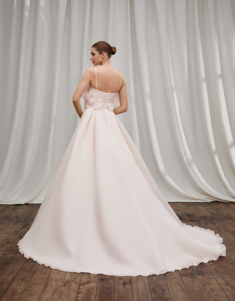 Model Jania is een romantisch eerbetoon aan de passie voor bloemen van de familie van Alberto Palatchi. Deze trouwjurk is volledig gemaakt van zijdezachte organza in zowel klassiek ivoor als flamingo roze. Het lijfje is strak uitgesneden en heeft een mooie handgemaakte bruidsbloem met subtiele blaadjes als echte eye catcher. De a-lijn rok is soepel en heerlijk draagbaar zorgt voor elegante bruidslook.