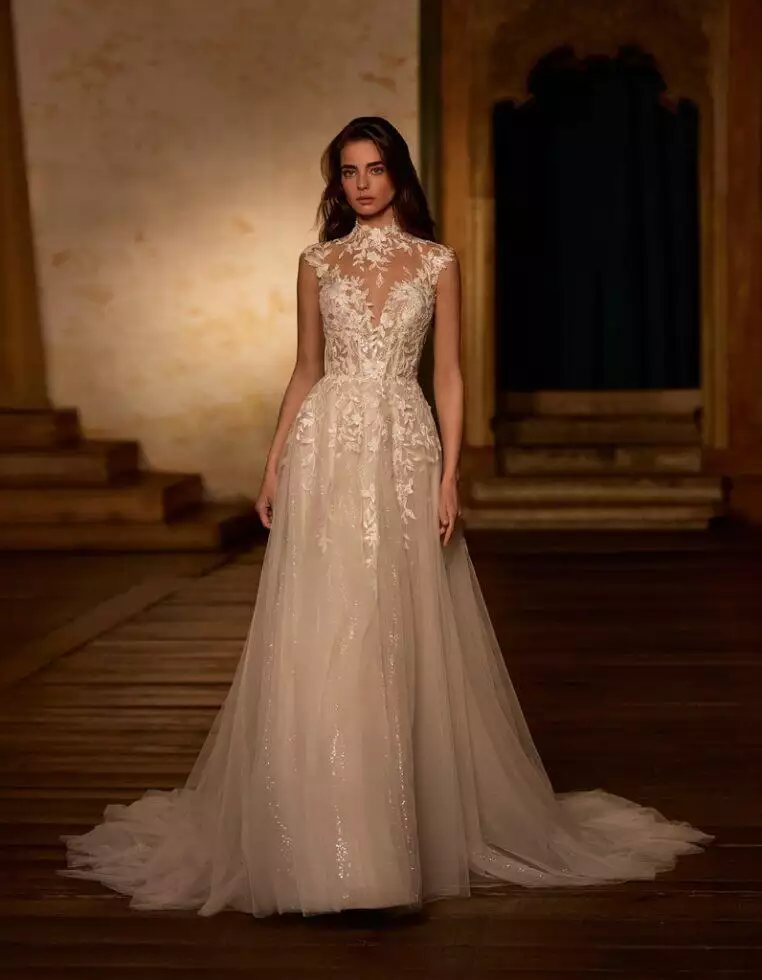 De Jourdan trouwjurk uit de Alberto Palatchi collectie is de perfecte keuze voor de bruid die elegantie combineert met een vleugje sprookjesachtig romantisch detail. De jurk heeft een verfijnd hoog lijfje met delicate kantapplicaties, gecombineerd met een zachte tulle rok in A-lijn silhouet, wat zorgt voor een flatterende pasvorm en een gewichtloze uitstraling. De romantische uitstraling van Jourdan maakt ‘m ideaal voor klassieke ceremonies, buitenbruiloften of in een kasteelachtige omgeving. A