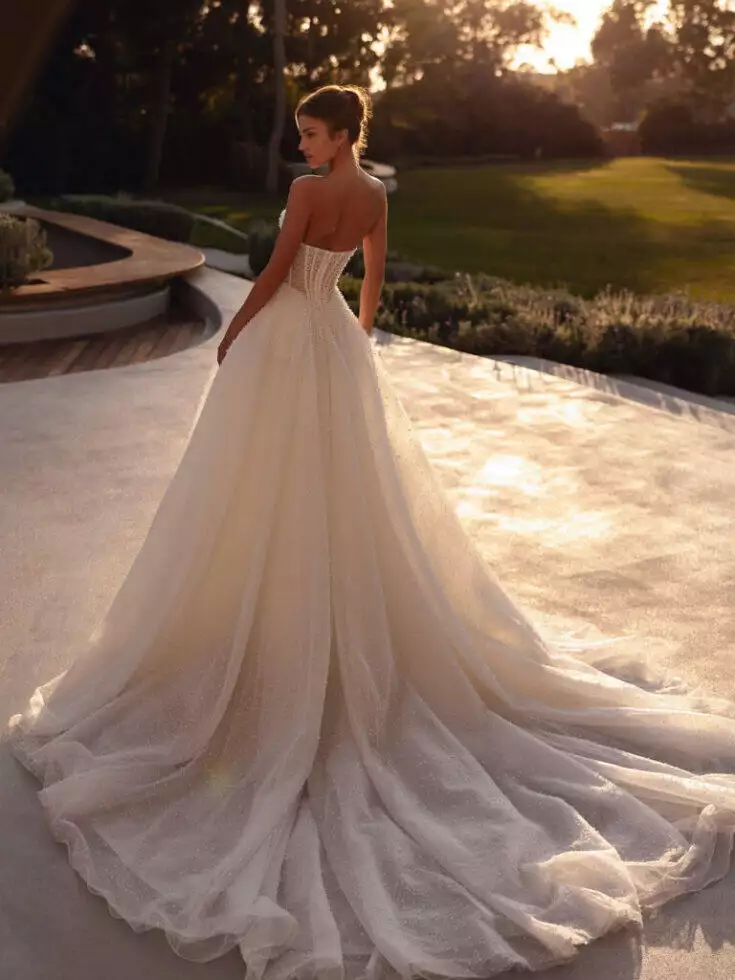 Stijl 1505 is pure poëzie in beweging. Het met parels geaccentueerde korsetlijfje zorgt voor een verfijnde structuur, terwijl de luchtige tule rok met elke stap meezweeft. Voor een extra vleugje romantiek combineer je hem met de bijpassende transparante handschoenen (SL108) en laat je de look voor zich spreken.