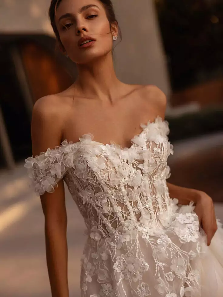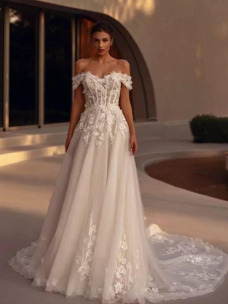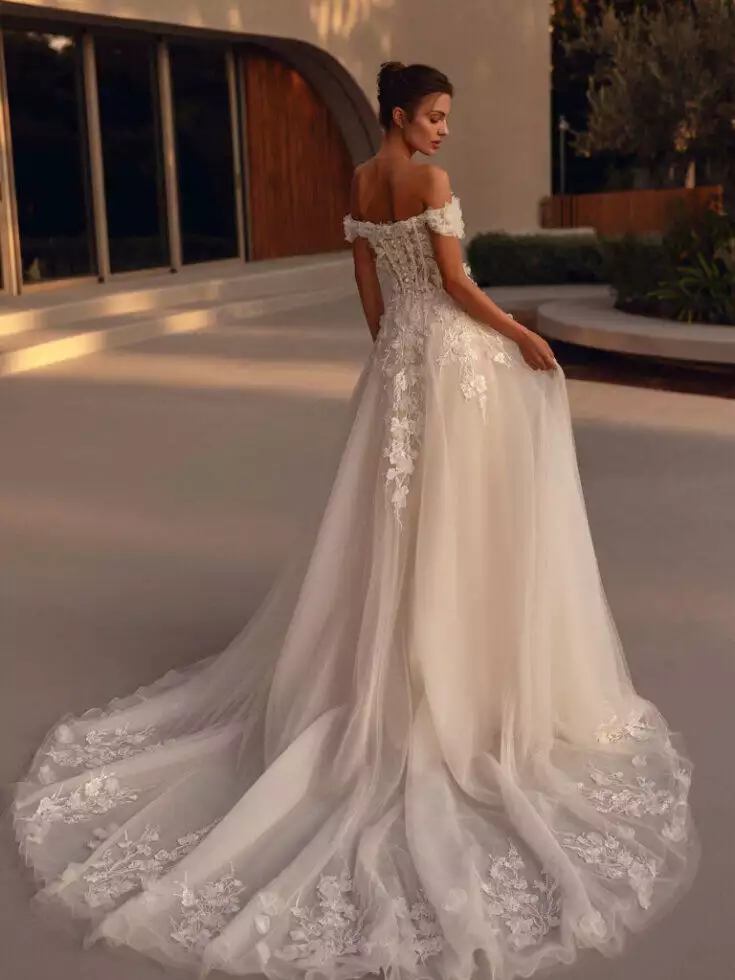 Een look die van nature betoverend aanvoelt. Stijl 1507 is poëzie in beweging. Een romantische off-shoulder halslijn ontmoet een zacht gestructureerd korsetlijfje, met bloemenkant dat over een vloeiende tule rok en een dromerige sleep valt.