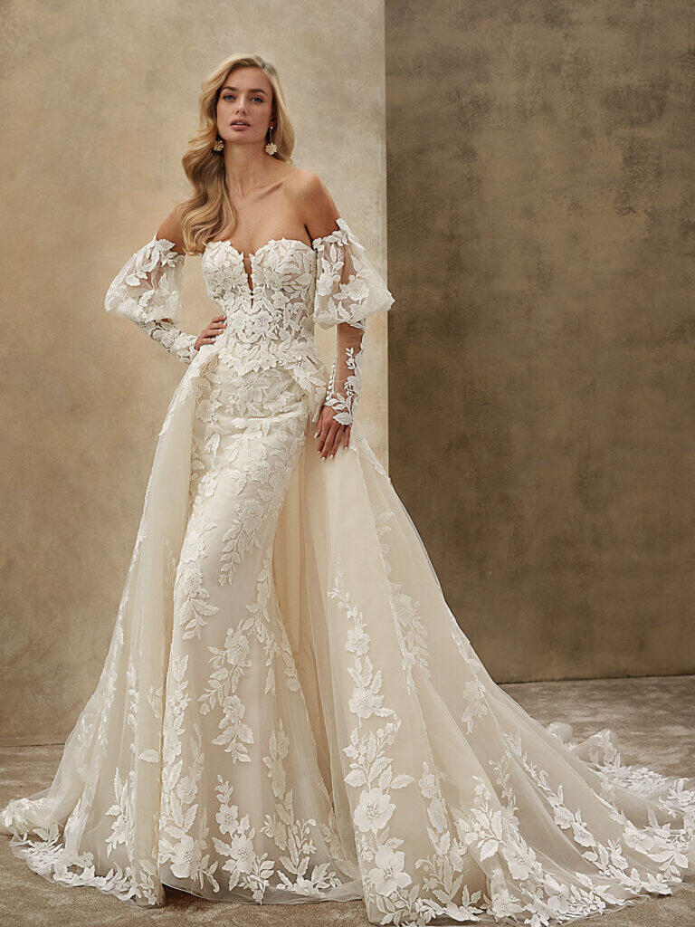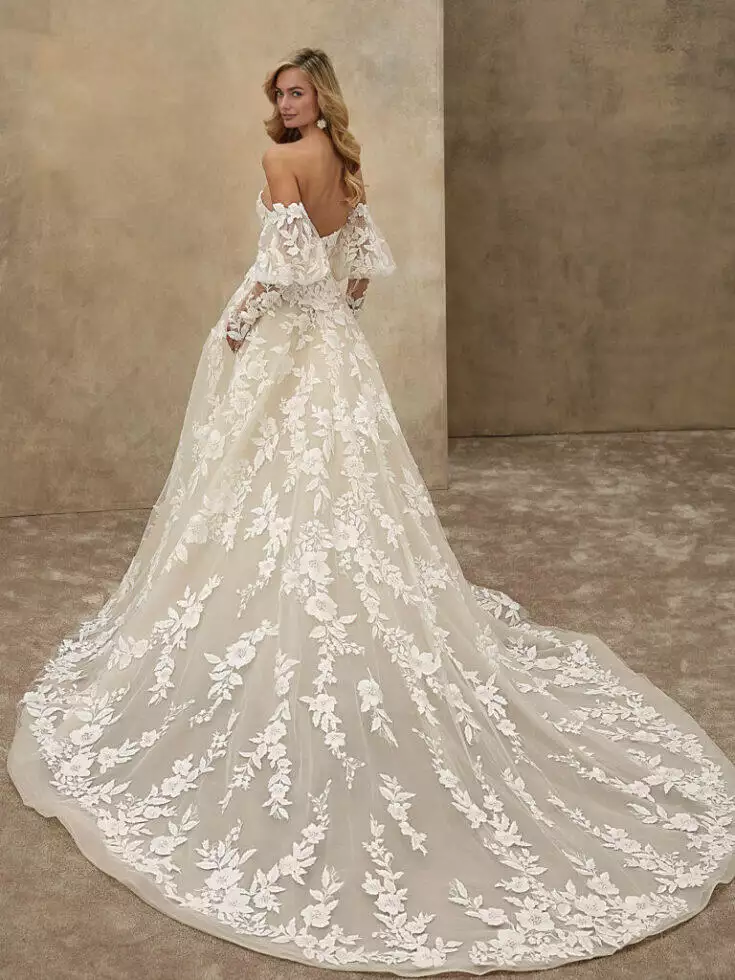 Maak jouw totaal plaatje helemaal compleet met onze bijpassende bruidsaccessoires, zoals bruidssluiers met kant of parel bewerking, handschoenen, bruidsschoenen en haaraccessoires.