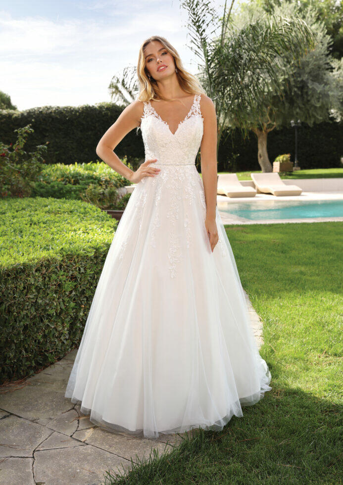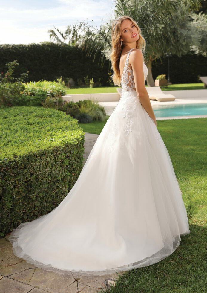 A-lijn prinsessentrouwjurk gemaakt van doorzichtige tule met een zachte structuur voor een perfecte pasvorm. Het semi-transparante lijfje bezaaid met bloemenkant zorgt voor een romantisch en trendy effect.