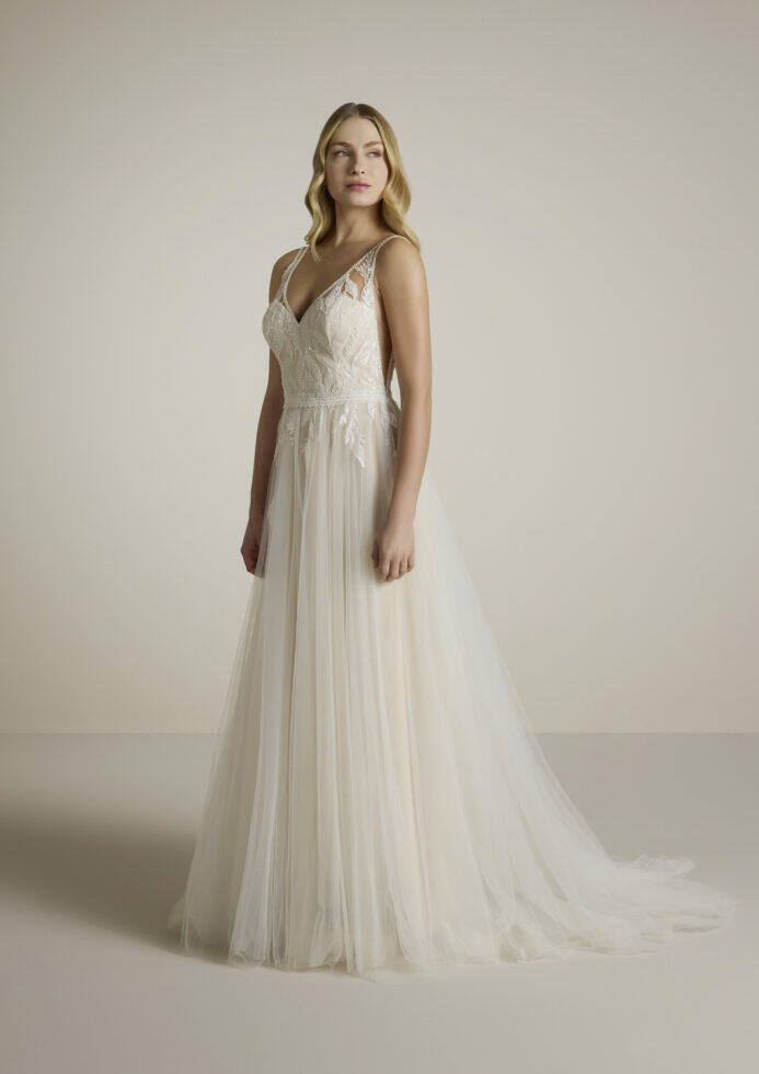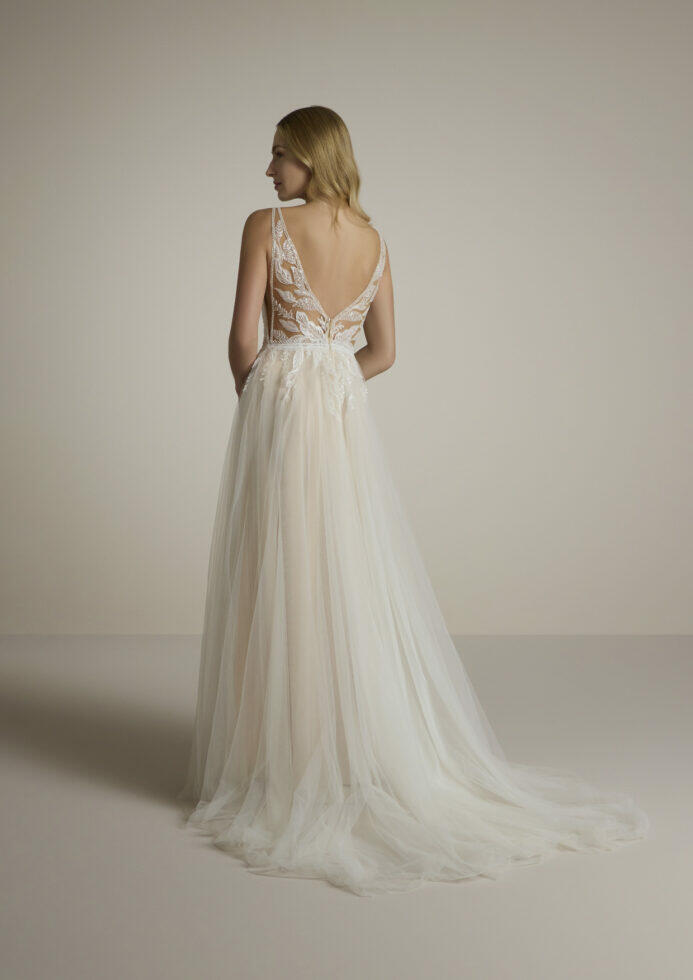 Euthalia is een speelse en romantische trouwjurk, perfect voor een relaxte en informele bruilft. Het lijfje heeft een V-hals, en borduurwerk van kant en kralen op de bandjes met een transparante achtergrond. De achterkant is transparanter en loopt uit in een uitgesproken V-hals.