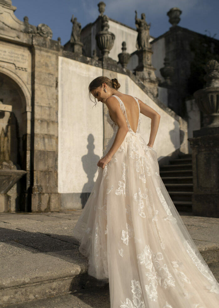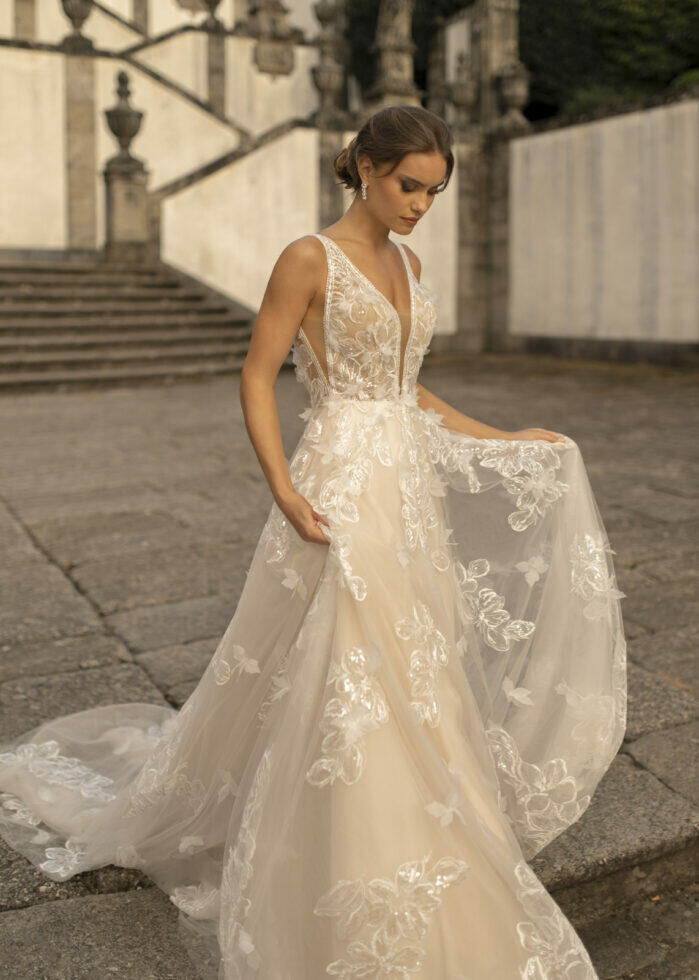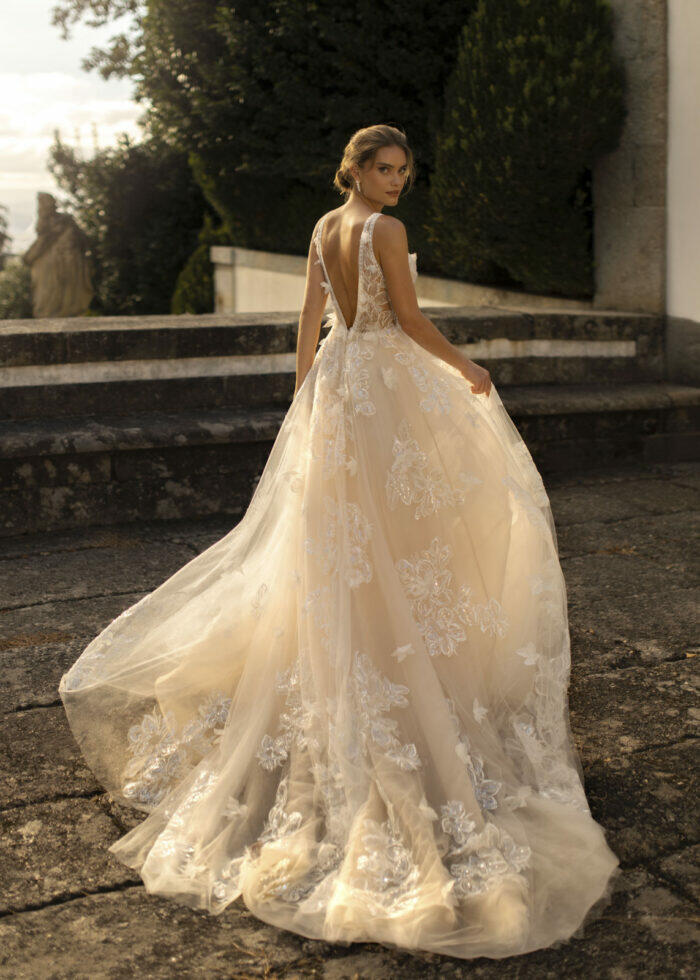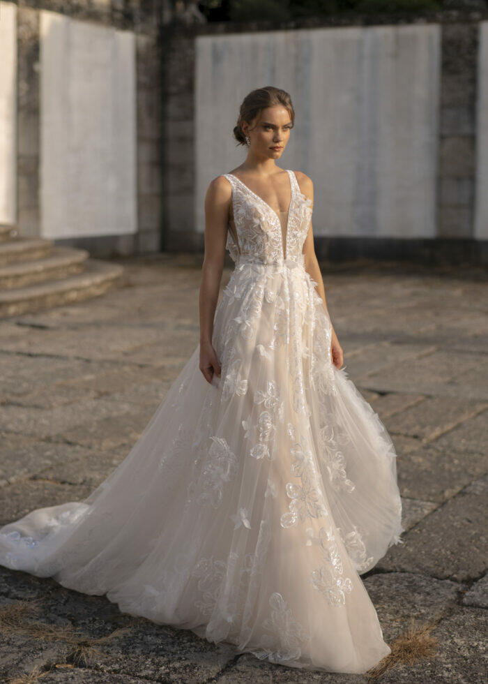 Kimbel heeft een traditioneel A-lijn silhouet met een diepe halslijn. De tule rok is versierd met applicaties van lovertjeskant en 3D-bloemen geven deze look een vleugje grillige romantiek. Voel de magie van de dag terwijl je straalt in deze prachtige jurk die jouw persoonlijkheid en liefde weerspiegelt. Of het nu gaat om een intieme ceremonie, een groots feest of een sprookjesachtige setting, de juiste trouwjurk maakt jouw dag onvergetelijk.