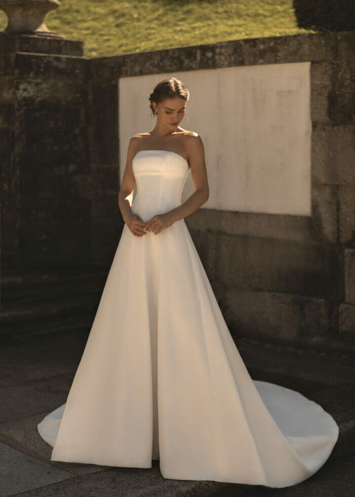 Knox is een slanke en verfijnde strapless satijnen jurk. Met zijn strakke lijnen en minimalistische ontwerp straalt deze jurk moeiteloze elegantie en ingetogen luxe uit. Knox is de perfecte keuze voor de bruid die houdt van tijdloze stijl en eigentijdse verfijning. Eenvoudig en zo bijzonder, houd je jurk in zijn less is more uitstraling met een een prachtige sluier bezaaid met parels of draag een elegante kanten innertop welke na de ceremonie uit gaat.