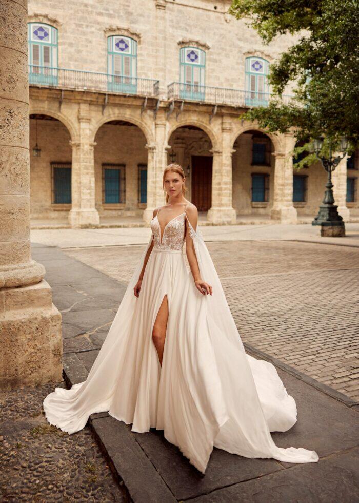 De prachtige bruidsjurk Lumen heeft een illusie kanten lijfje met een diepe, verleidelijke V-halslijn die zorgt voor een vrouwelijke en moderne look. De luchtige chiffon rok met hoge split geeft een speelse en sensuele touch, perfect voor de bruid die graag straalt en vrij wil bewegen op haar grote dag.