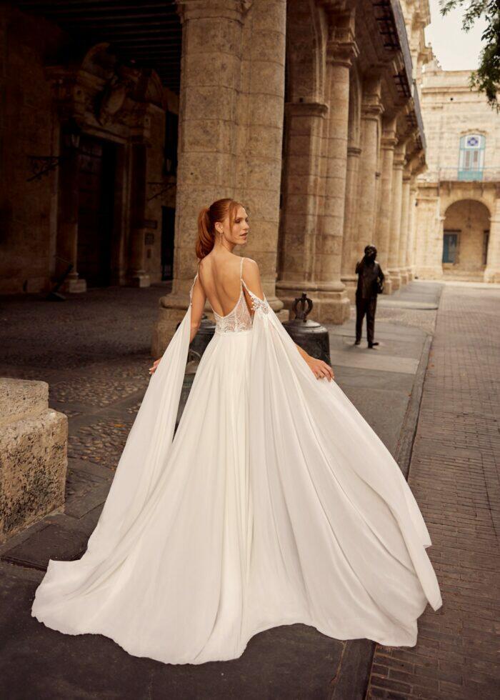 De off-the-shoulder mouwen vallen losjes over de armen en geven een zachte, dromerige uitstraling aan deze jurk. De Lumen bruidsjurk combineert romantiek en stijl op een unieke manier en is ideaal voor een zomerse bruiloft, een strandceremonie of een romantisch buitenhuwelijk.