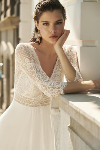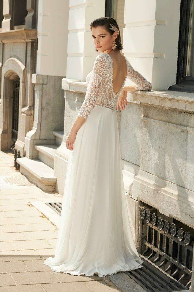 Deze prachtige jurk model Camarillo heeft een kanten top met een V-hals zowel voor als achter. De driekwart mouwen, taille en rug zijn doorschijnend. De voorzijde heeft een ivoorkleurige voering en in het midden een stuk transparante stof. De jurk heeft een zwierige chiffon rok met een sleepje.