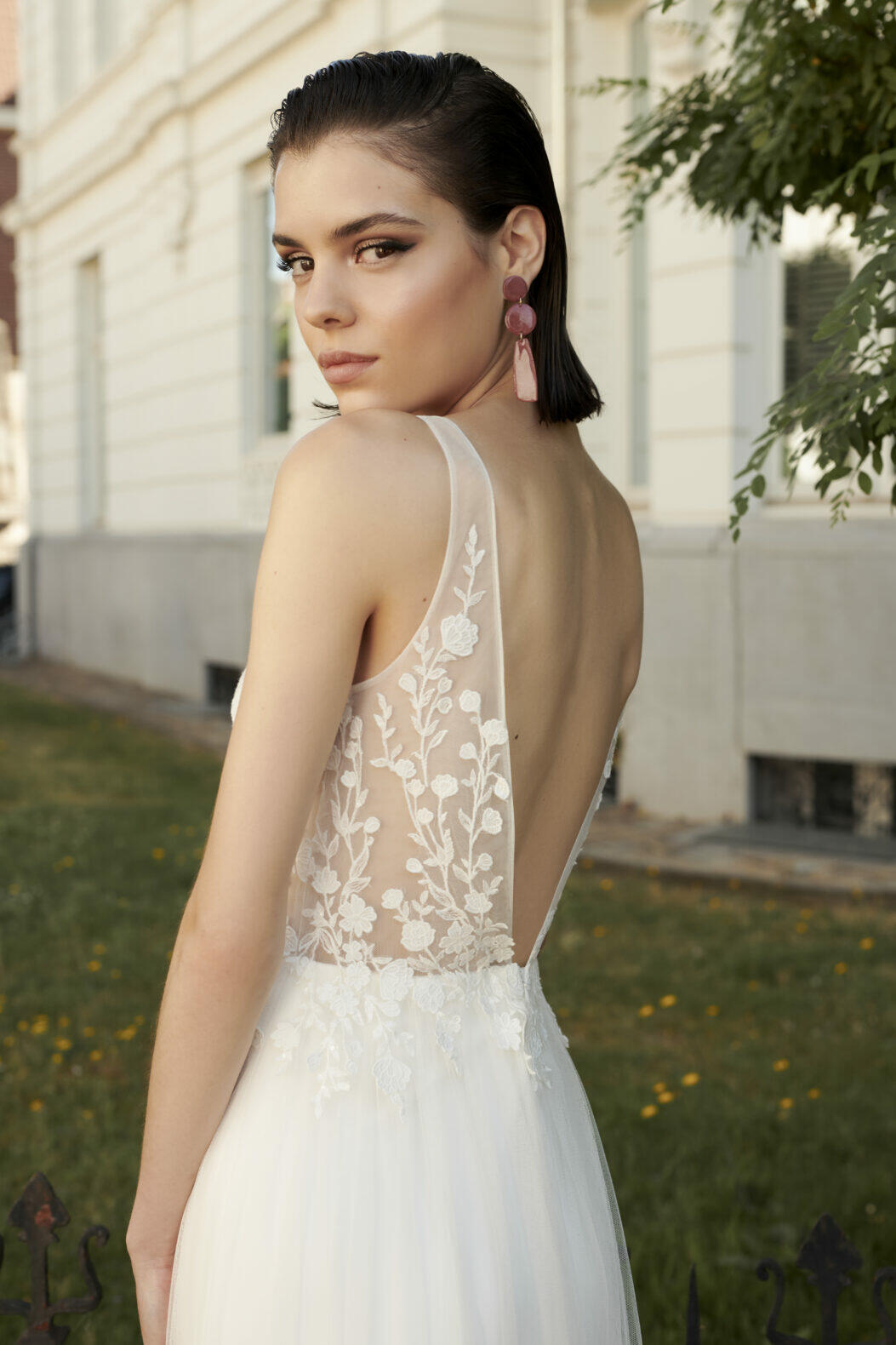 White Lotus heeft een doorzichtige ivoor kleurige tule top versierd met 3D bloemapplicaties. Zowel de voor- als achterkant hebben een diepe uitsnijding. De voorkant heeft in het midden een klein stukje transparante stof. De rok is gemaakt van crêpe met een toplaag van tule die zorgt voor een mooie soepelheid en zwierige sleep. Een perfecte jurk om in te dansen!