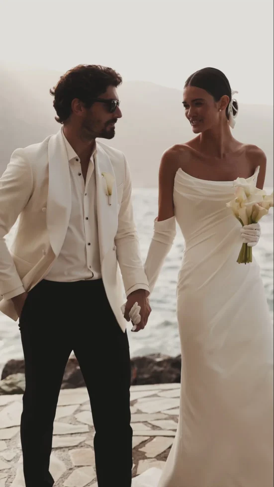 Kunstzinnig gedrapeerde rechte trouwjurk Amelise van luchtige chiffon komt uit de prachtige Milla Nova collectie. Met een gestructureerd, scherp, met de hand gedrapeerd strapless korset met ritssluiting aan de achterkant, en een getailleerde maxi-rok met een midi-sleep en asymmetrische drapering over de gehele lengte die het lichaam prachtig contouren. Kan worden gecompleteerd met een satijnen gevlochten hoofdband Amelise of een prachtige haarband Amelise versierd met parels, met een calla lelie als middelpunt. De jurk heeft afneembare off-shoulder mouwen.