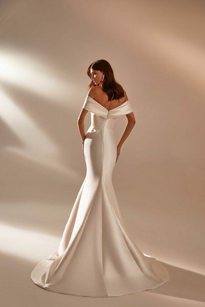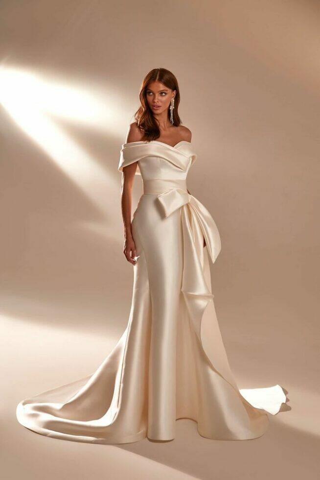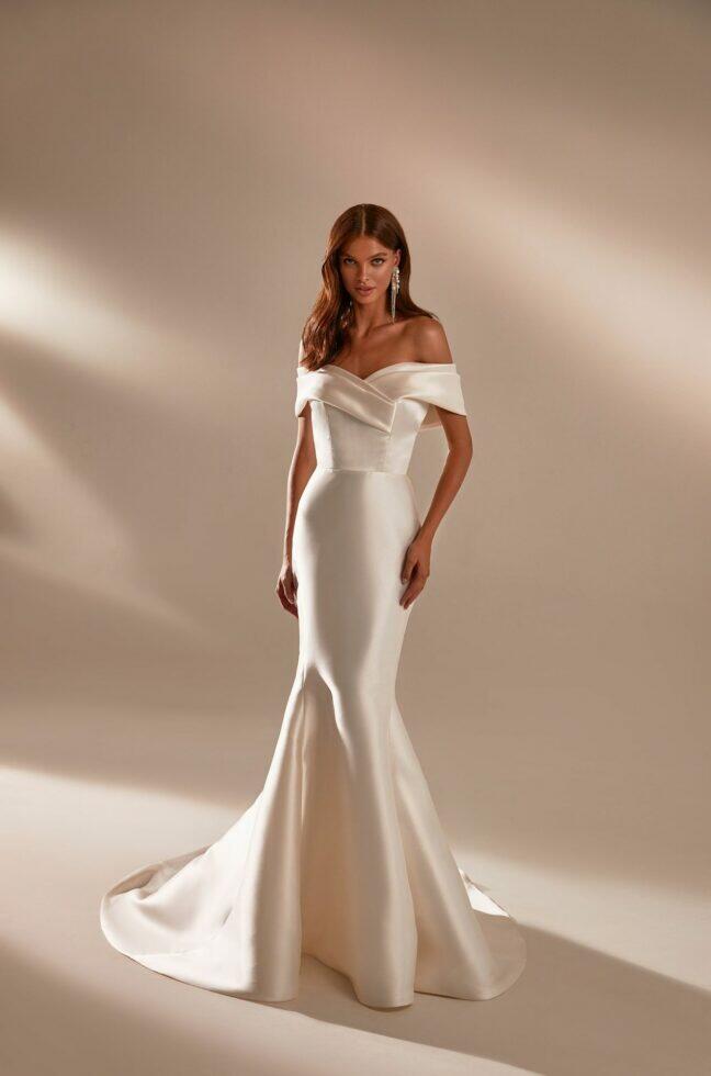 April is een prachtige zeemeermin off-the-shoulder mikado bruidsjurk met een hartvormige halslijn, gedrapeerd lijfje en een lange sleep. Maak jouw look compleet me de grote afneembare mikado strik aan de voorkant.