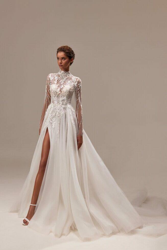 Cassidy is een opvallend ensemble met lange mouwen en een versierd semi-transparant lijfje. Met versierd met kant en pailletten ornament col lijfje met lange mouwen, een geknoopte rug en een prinsessen pofmouw van tule met een lange sleep en een gedurfde split.