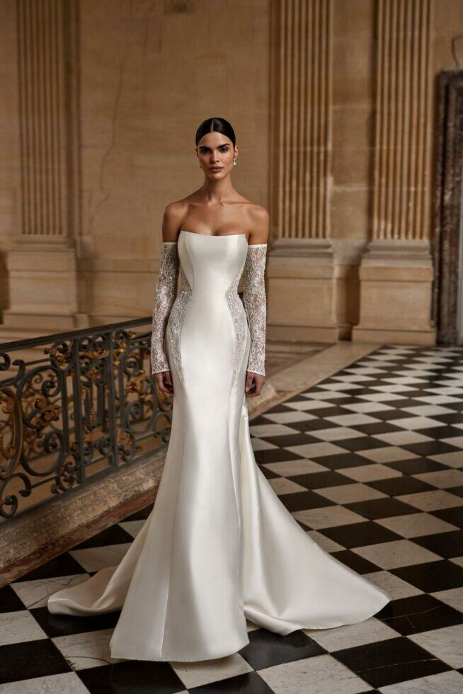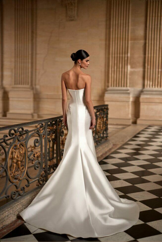 Verfijnde mikado zeemeerminjurk model Elsmir uit de Milla Nova Chapter Bride collectie met een rechte corsetbustier en een ritssluiting aan de achterkant. Een opvallende paillettenversiering langs de taillelijn benadrukt het figuur-omsluitende silhouet, moeiteloos overgaand in een sierlijke zeemeerminrok met een delicate sleep.
