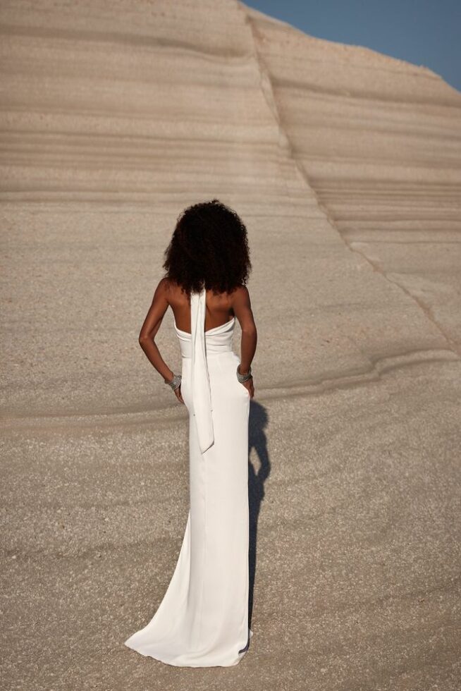 Model Elvira is een oogverblindende verfijnde mouwloze bruidsjurk van soepele satijn met een col en een wikkelrok met een sexy split. Deze jurk heeft een prachtige less is more uitstraling, het model en materiaal is werkelijk een lust voor het oog en zit als een tweede huid op het lichaam. Voel je elegant en sexy op jullie bruiloft.