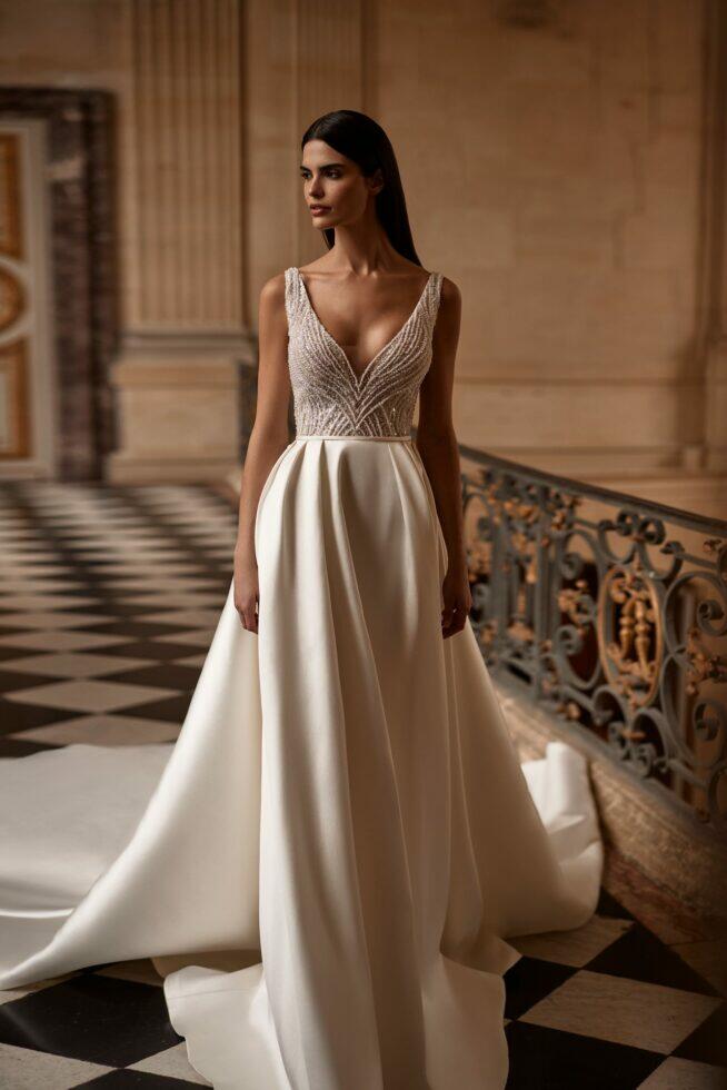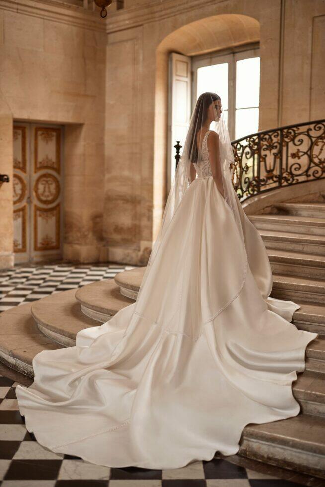 Evidence is een opvallende A-lijn mikado-jurk met een volledig versierde top en een grandeur maxi-rok. Met een illusi diep uitgesneden V-halslijn, een nauwkeurig met de hand versierd figuur-omhullend lijfje met pailletten en parels, een delicate lintriem die de taille accentueert met strikdetail aan de achterkant, een sierlijke V-vormige open rug vastgezet met een rits en een volumineuze mikado-rok versierd met knoopdetails langs de achterkant, afgewerkt met een weelderige lange sleep.
