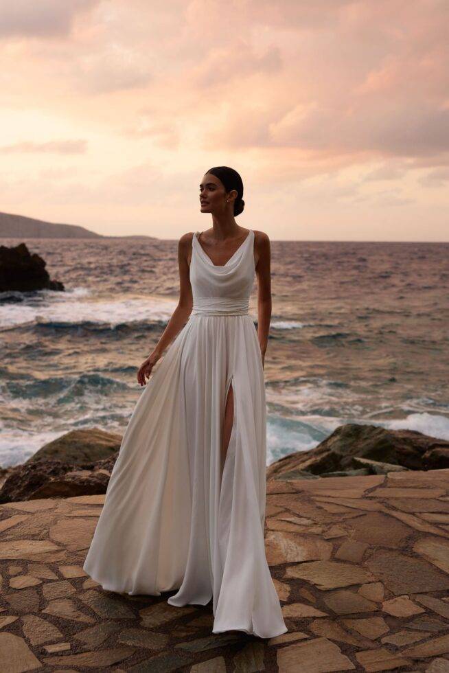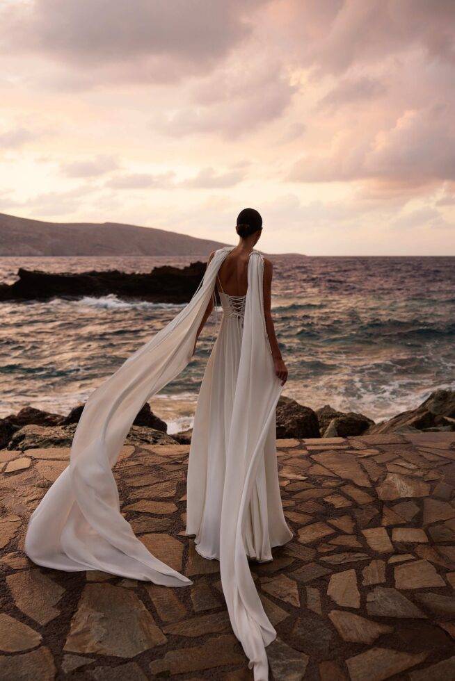 Fawna is een luchtige A-lijn trouwjurk van chiffon met een gedrapeerde col die doet denken aan oude Griekse kledij, een getailleerde taille met delicate ruches die het silhouet prachtig accentueert, en een zwierige A-lijn rok die sierlijk tot op de vloer valt en een goddelijke allure creëert. Voor extra dramatiek kan de jurk worden gestyled met een weelderige lange sleep. Kan worden gecompleteerd met een lange chiffon Fawna sjaal voor extra bedekking en een vleugje luchtige romantiek.