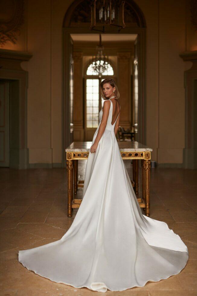 Kendra is een geraffineerde en minimalistische A-lijn trouwjurk in parelmoer mikado uit de Milla Nova chapter Bride collectie. Met een delicate diep decolleté die het decolleté accentueert, brede bandjes, een verleidelijke open rug en een volle rok met een kathedraalsleep.
