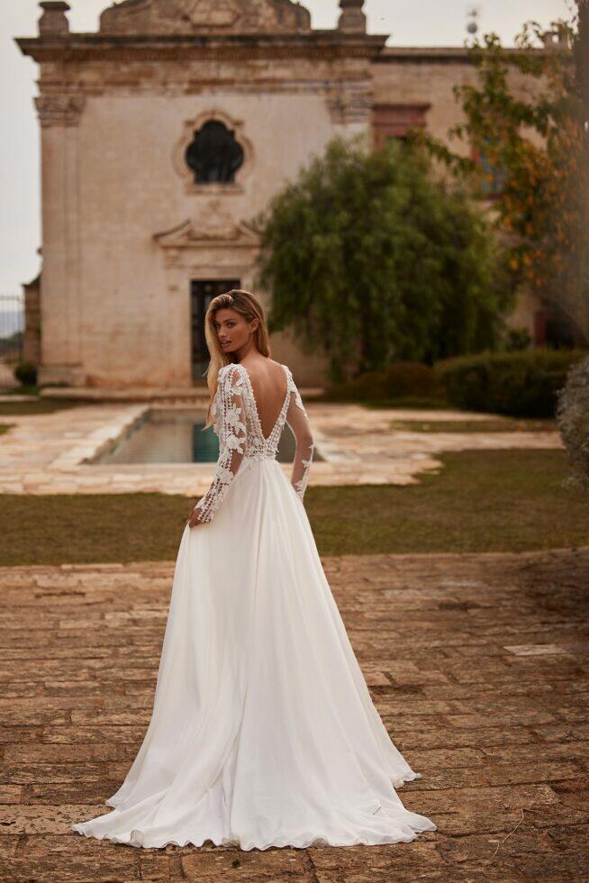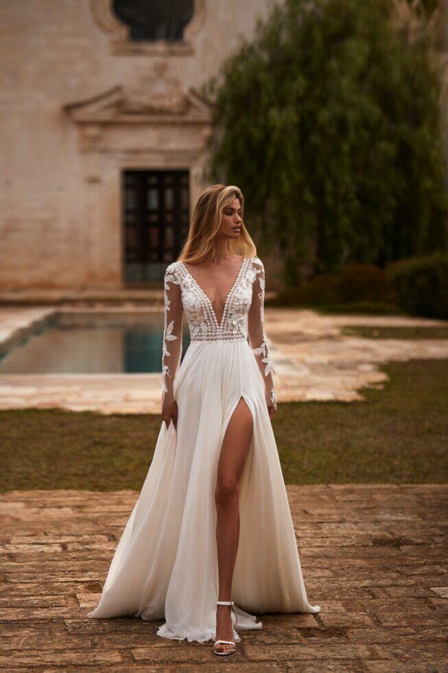 Maeve is een boho-stijl A-lijn trouwjurk, delicaat versierd met bloemenkant applicaties. Met een diep uitgesneden illusie V-halslijn en een lijfje met baleinen versierd met dromerige bloemenapplicaties die elegant bloeien op de doorschijnende lange mouwen. De jurk heeft een diepe open V-rug en een zwierige prinsessenrok met een midi-sleep en een verleidelijke dijsplit.