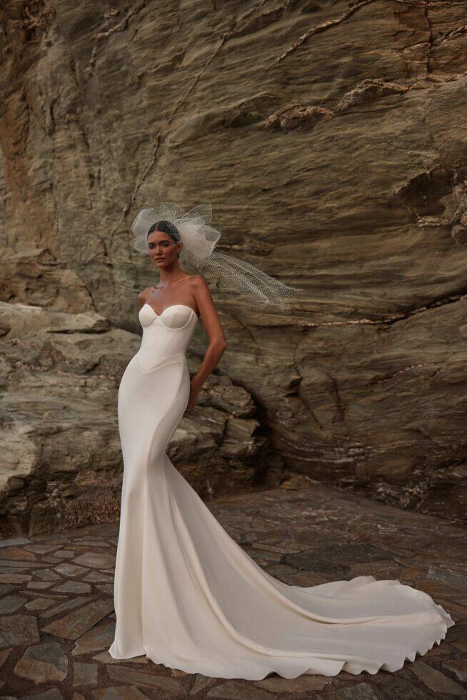 Mirela is een minimalistische zeemeermin trouwjurk van satijn. Voorzien van een korset met baleinen en ingebouwde cups voor extra ondersteuning, een hartvormige halslijn en een ritssluiting aan de achterkant voor een naadloze pasvorm. Het curve-accentuerende silhouet loopt naadloos over in een zachte zeemeermin zoom met een lange sleep. De jurk heeft afneembare off-shoulder mouwen. Kan worden gecompleteerd met een Mirela sjaal met schattige strikjes voor een vleugje drama. Voeg aan de jurk een glamoureuze haarband toe, gemaakt van fijn gestippeld mesh. De jurk heeft afneembare off-shoulder mouwen.