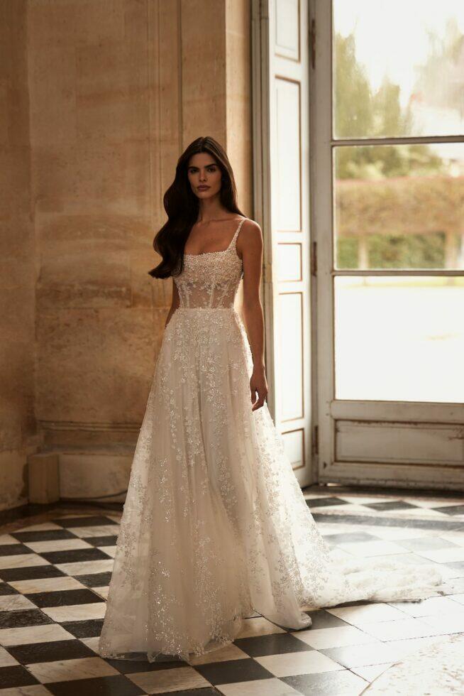 Perugia is een betoverende A-lijn trouwjurk, uit de Milla Nova chapter Bride collectie en is met de hand versierd met een bloemenpatroon van parels en pailletten. Met een vierkante halslijn ondersteund door delicate spaghettibandjes, met een ritssluiting op de rug en een volle rok met een nude voering en een mooie ronde bruidssleep.