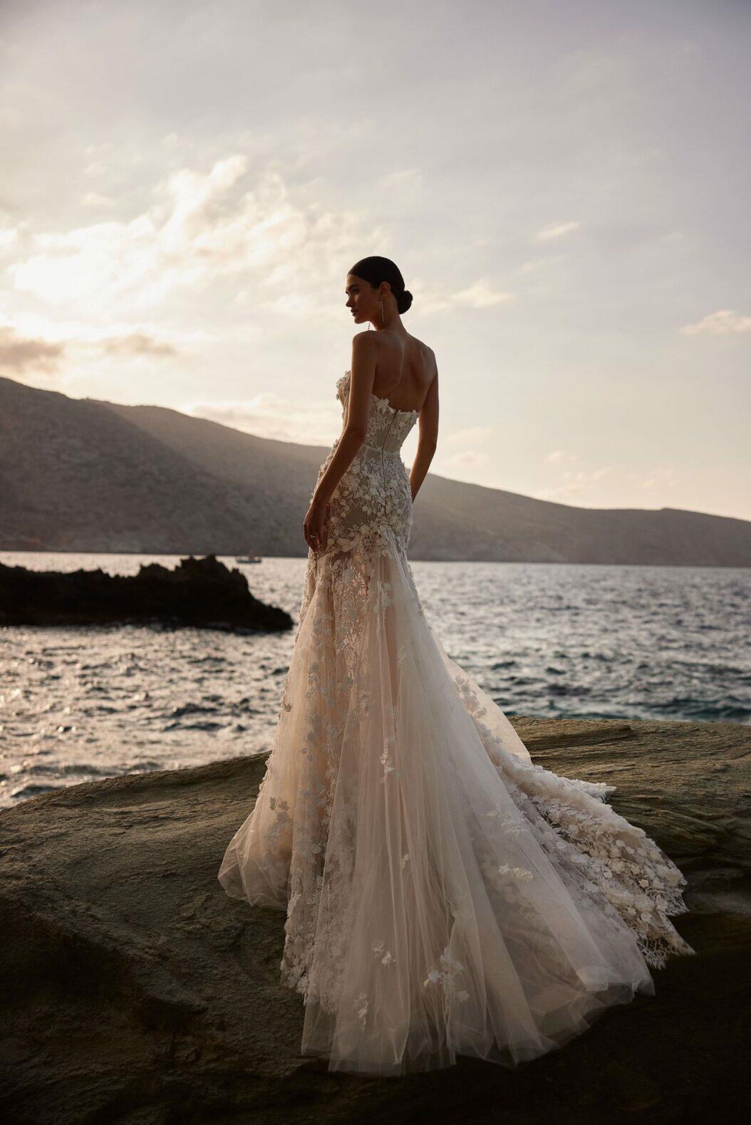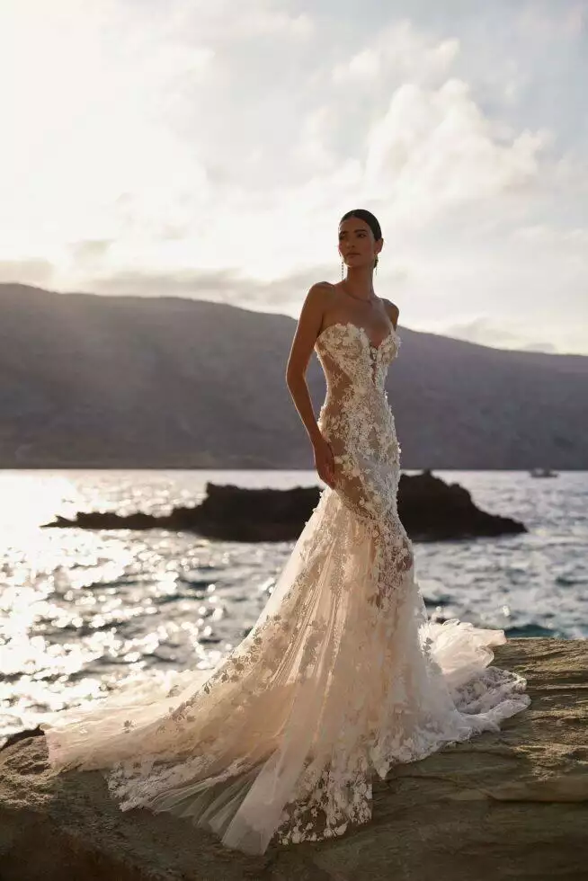 Rosetta is een prachtige zeemeerminjurk gemaakt van semi-transparant kant, subtiel versierd met bloemen- en kralenapplicaties. De jurk heeft een hartvormige halslijn met een diepe V-hals, ingebouwde cups in een gestructureerd lijfje met baleinen, afneembare off-shoulder mouwen en een rits- of vetersluiting aan de achterkant. De getailleerde semi-transparante rok, met een afneembare nudekleurige onderrok, loopt sierlijk uit in een pofmouw van nudekleurig tule met een delicate sleep. Inclusief afneembare off-shoulder mouwen van tule.