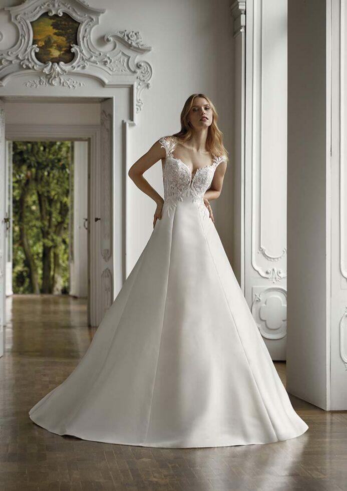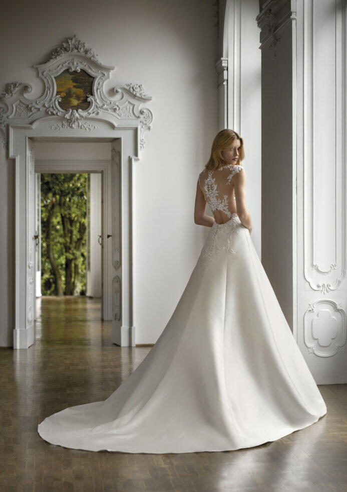 Deze prachtige moderne baljurk model Goreme uit de Nicole Milano collectie is gemaakt van luxueus mikado combineert elegantie en romantiek en heeft een prachtig illusie-kanten ontwerp aan de achterkant dat op flirterige wijze opengaat aan de basis. Het lijfje met kap mouwen en V-hals is versierd met kanten applicaties die de heupen omlijnen en organisch overgaan in de zijdeachtige rok en sleep.
