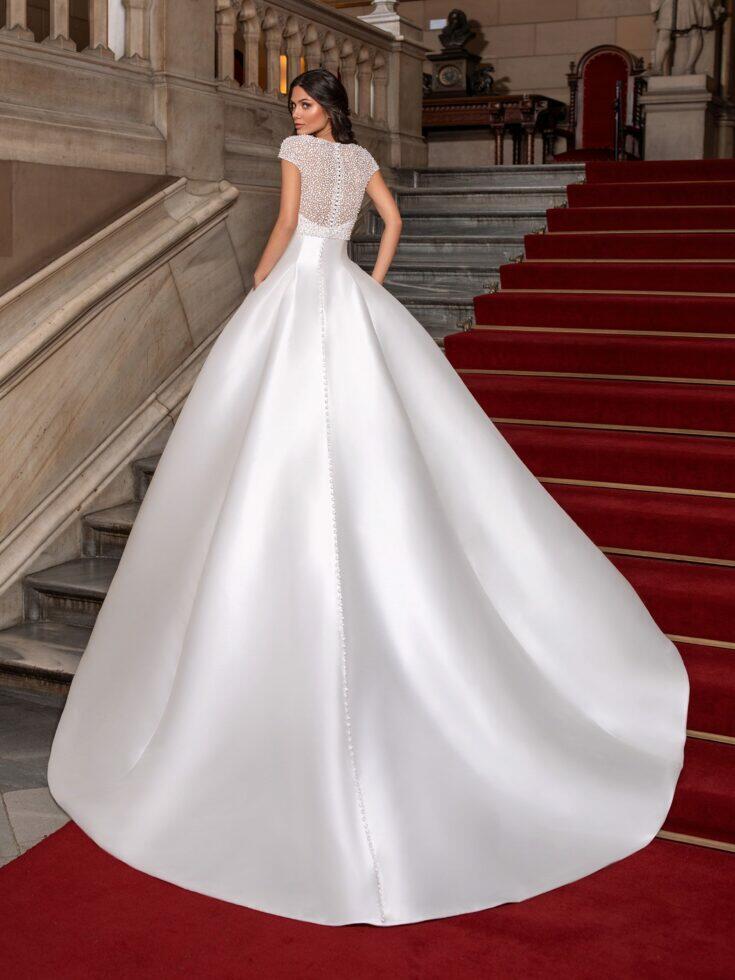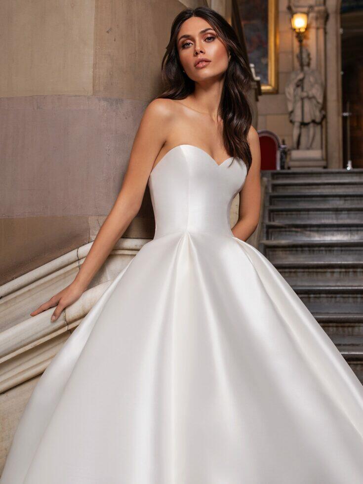 Ontdek de elegante trouwjurk ‘Close’ van Pronovias: een verfijnde strapless A-lijn jurk in luxueus mikado met een minimalistisch ‘less is more’ ontwerp. Voeg extra glamour toe met het bijpassende glitterjasje, perfect voor een moderne en stijlvolle bruiloft. Ideaal voor de bruid die houdt van tijdloze klasse en subtiele verfijning.