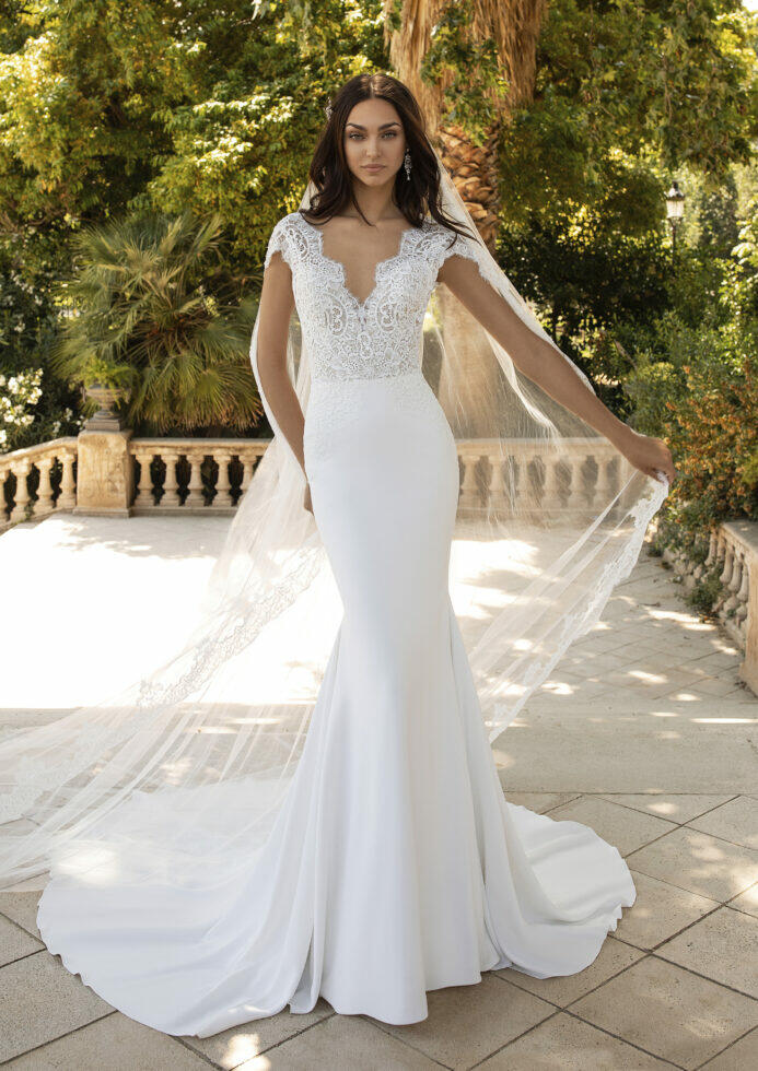 Model Milady uit de Pronovias collectie, heeft een subtiel pailletten bewerking op een delicaat lijfje van geschulpte Chantilly kant. De overgang naar een strakke rok van crêpe is een elegante fishtail uitstraling. Tevens hebben wij dit model met lange kanten mouwen in onze winkel.