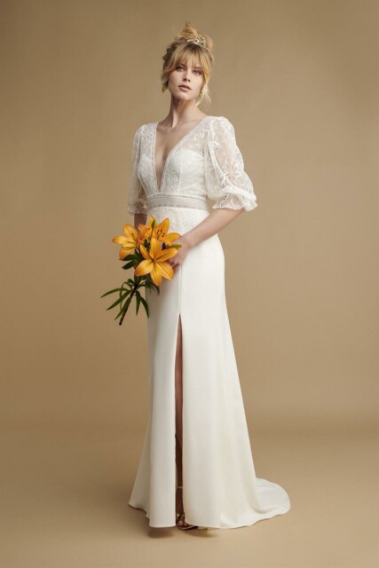 Model Per Sempre uit de Rembo Styling collectie, is een elegante jurk van crêpe met een V-hals. Het heeft lange mouwen en een open rug. De jurk is vervaardigd in crêpe voor een pure look, afgewerkt met moderne kanten details. De rok heeft een split aan de voorkant en een lange sleep.